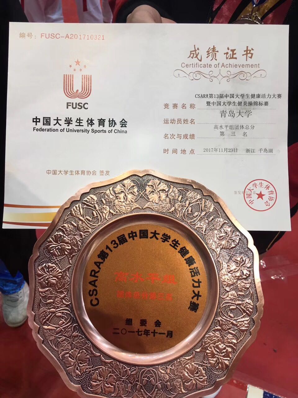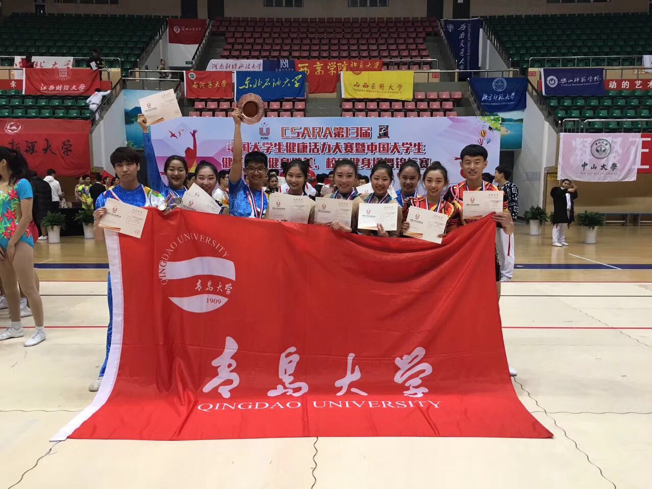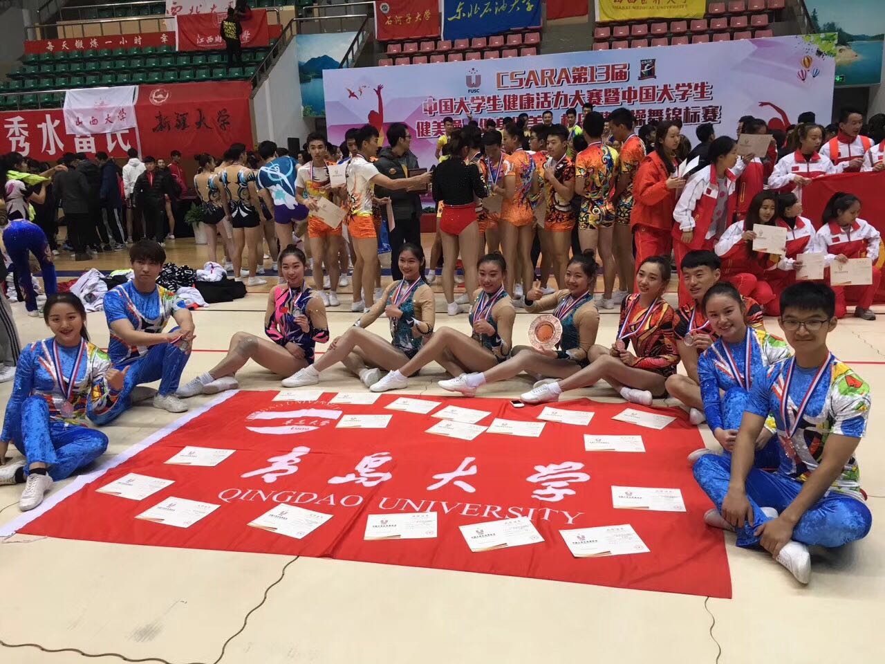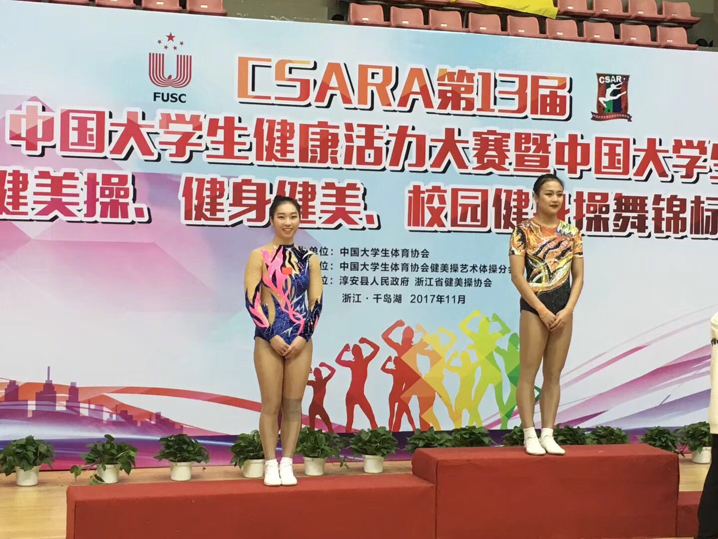 红足1世官网健美操队最终获得高水平组团体总分第三名及女单第二名、混合有氧舞蹈第二名、女子三人第三名、女子五人第二名和混双第五名的优异成绩。