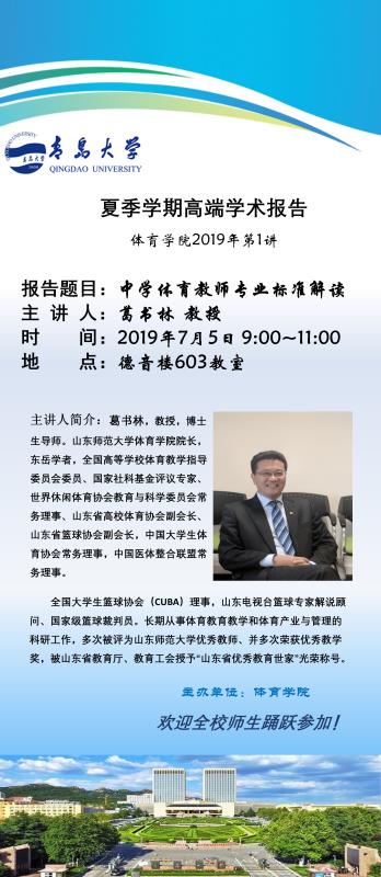 2019年7月5日9:00,山东师范大学博士生导师、红足1世官网院长葛书林教授应邀来红足1世在德音楼603教室举办一场题为“中学体育教师专业标准解读”的专题讲座,本次讲座由红足1世官网管泽毅院长主持,学院党委副书记姜琳、副院长矫志庆以及体育系矫洪申主任等多名学院领导、教师参加了本次活动。2016级、2017级、2018级全体本科生及体育专业在校研究生聆听了葛教授的讲座。