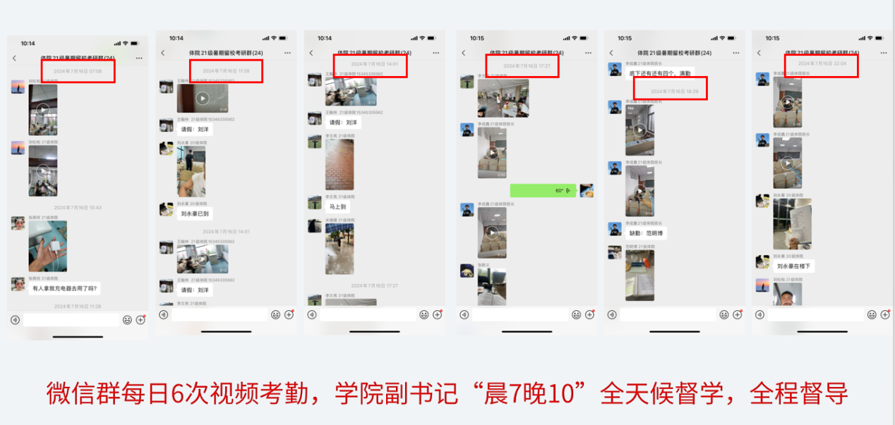 2、“六次视频打卡”,锻造自律铁律:假期期间,学院针对学生特点,结合学生实际需求,采取严格有效的管理举措。所有假期留校或居家备考的学生,需加入学院指定的考研互助监督打卡群,学生严格按照规定的时间节点每天从早到晚进行六次学习情况视频监督打卡,视频内容需清晰显示学生本人及所处的学习环境、打卡时间、打卡地点,以证明其处于真实学习状态。