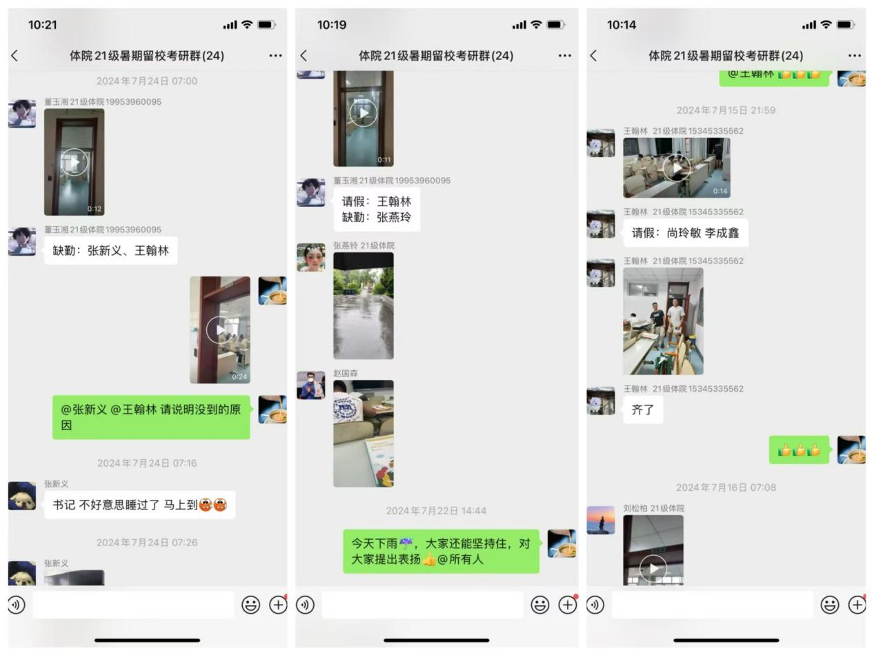 学院分管学生工作领导和辅导员全天候在线,在微信群中密切关注学生的出勤、学习情况,对未按时打卡、状态不佳的学生,第一时间进行提醒、询问,通过这种“晨7晚10”全天候、不间断的沉浸式陪伴督学,帮助学生养成良好的作息习惯和学习习惯,建立稳定的学习生活节奏。通过打卡让学生时刻感受到备考的紧迫感和同辈压力,形成“比学赶超”的良好氛围。这种近乎严苛的精细化管理方式是对学生自律性和意志力的极大锻炼,也与学院体育人“顽强拼搏、永不言弃”的精神特质相契合。
